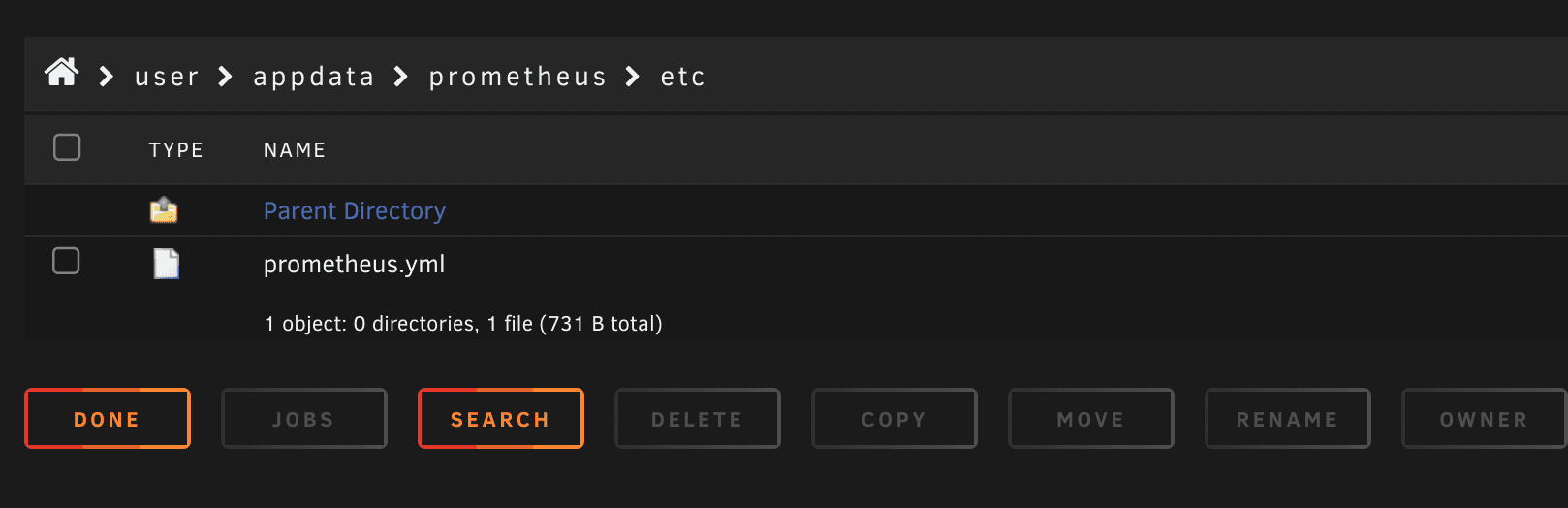 Open the Appdata folder, then go to the Prometheus directory, and upload the .yml file we just edited.