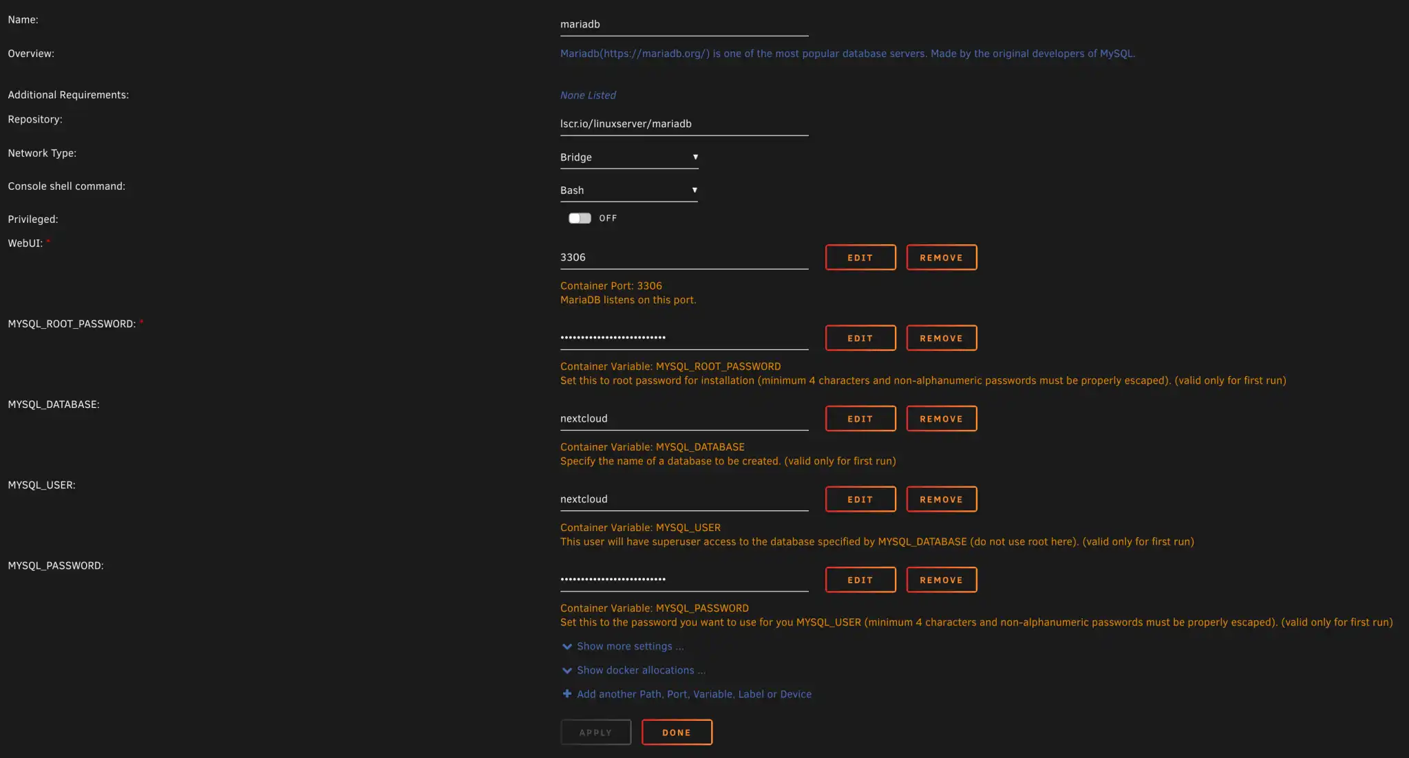 Go back to the Apps tab and search for “MariaDB” (a popular database for Nextcloud).